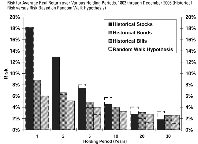 Ele concluiu que o desvio padrão das ações só é maior em curtos espaços de tempo, sendo menor que o dos títulos para prazos maiores.