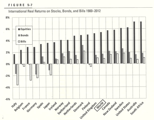 Embora infortúnios importantes tenham ocorrido em vários desses países, como guerra, hiperinflação e depressão, todos eles exibiram retornos acionários descontada a inflação consideravelmente positivos.