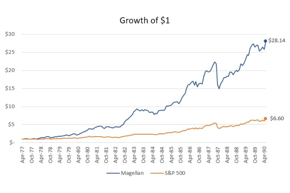 Retorno do Magellan Fund em comparação com o S&P, durante o período de 1977-90.