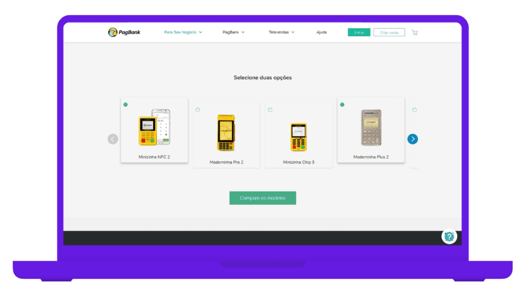 Para isso, o Pagbank desenvolveu em seu site uma ferramenta para comparar as maquininhas, na qual é possível entender com clareza as diferenças entre os modelos.