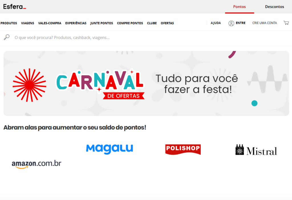 - Ganhe cashback, descontos e mais pontos com a Esfera: Compre no shopping Esfera e receba parte do valor de volta. Aproveite também, descontos em parceiros, opções para juntar mais pontos e trocar por produtos, viagens, experiência, vales-compra e muito mais.