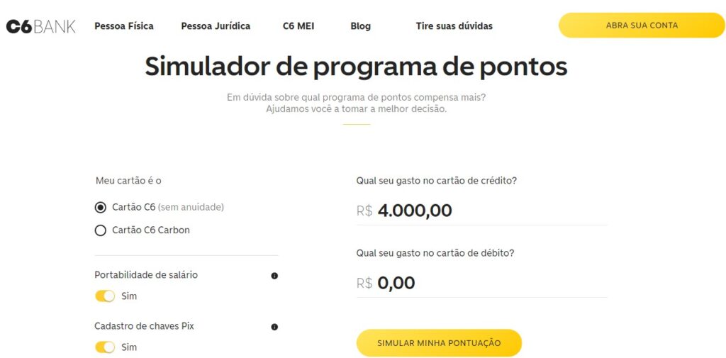 | C6 Débito | Acumula 0,03 ponto por real gasto na função débito |