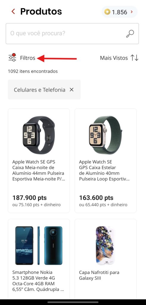 2. Para facilitar, vá em Filtros e selecione a opção “Celulares e Telefonia”. Ao clicar nessa categoria, irá mostrar tanto smartphones, quanto outros produtos relacionados, como relógio e acessórios.