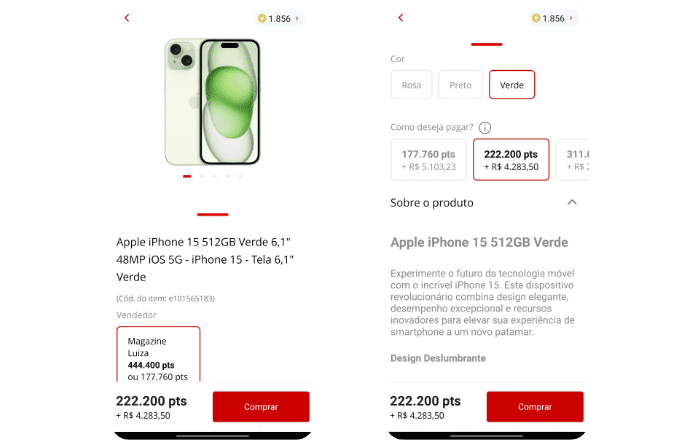 4. Nessa etapa, é possível escolher a loja, cor do aparelho, combinar o pagamento entre pontos + dinheiro e conferir todos os detalhes do celular.