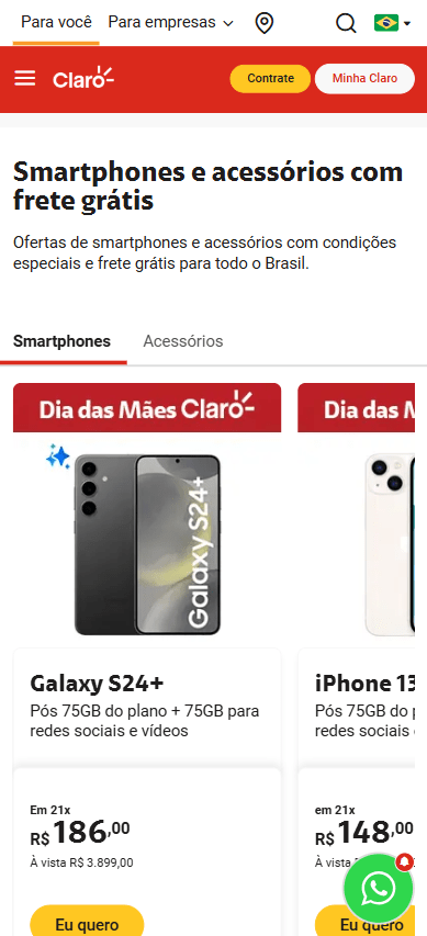 A Claro oferece smartphones com preços especiais e bônus de internet nos planos pós-pagos. Modelos como Motorola G35, Samsung Galaxy S24+ e iPhone 13 estão disponíveis com condições diferenciada no Claro Controle.