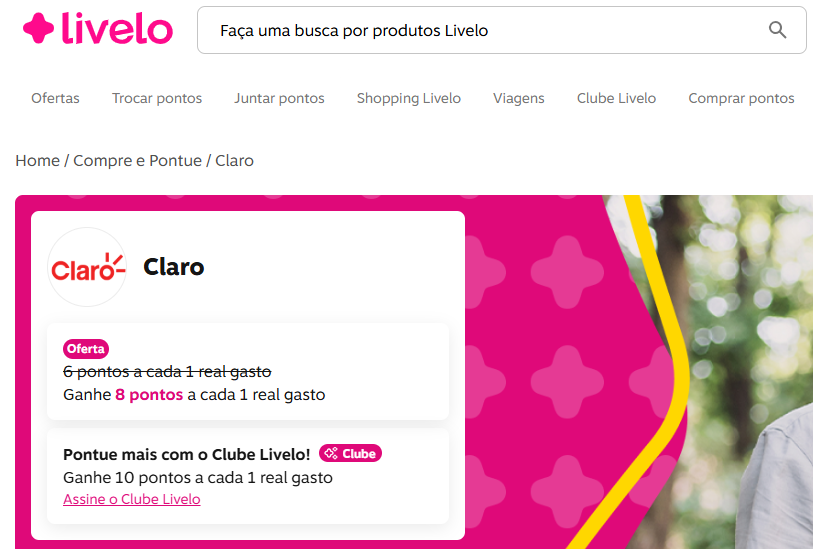 Na Livelo, você ganha até 10 pontos por real gasto na Claro.