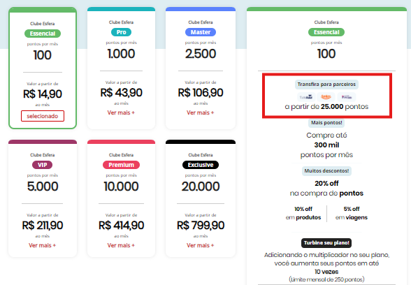 Os clientes do Clube Esfera possuem desconto na hora de fazer a transferência de pontos.