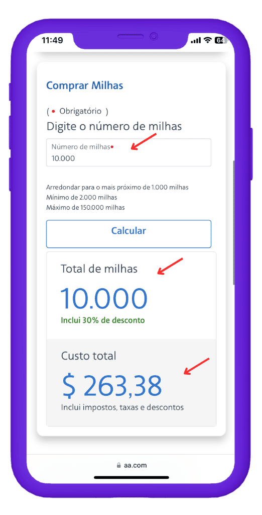 - 3. Informe quantas milhas deseja comprar e clique em “Calcular”;