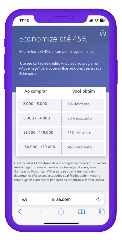 Mas antes de comprar é preciso cumprir com algumas regras, entre elas está ser membro do programa de recompensas AAdvantage há mais de 30 dias.