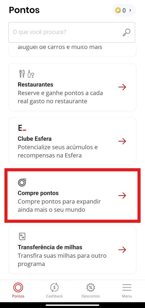 - Ganhe cashback, descontos e mais pontos com a Esfera: Compre no shopping Esfera e receba parte do valor de volta. Aproveite também, descontos em parceiros, opções para juntar mais pontos e trocar por produtos, viagens, experiência, vales-compra e muito mais.