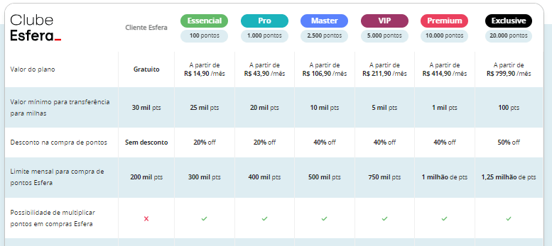 - Pontos Esfera: Ganhe 1,5 ponto a cada US$ 1,00 em compras.
