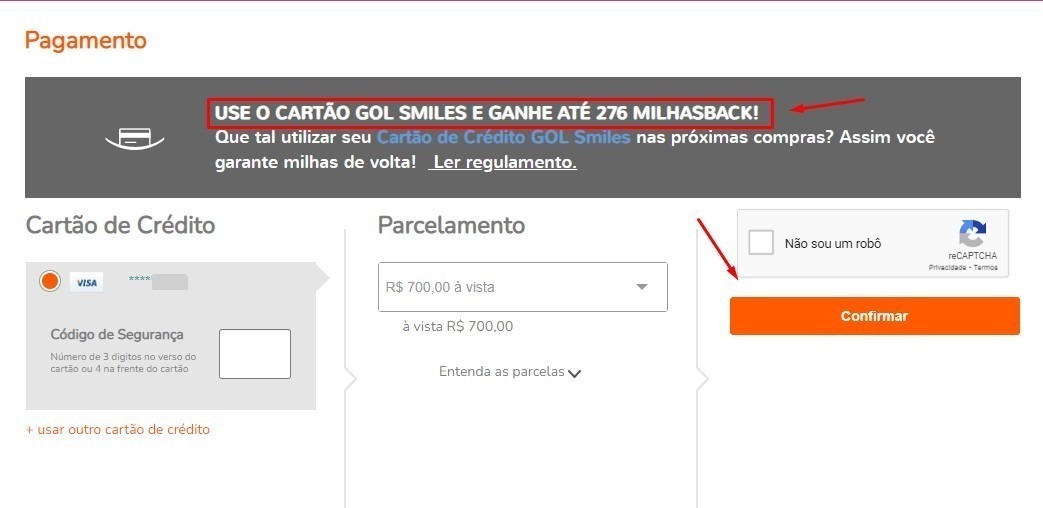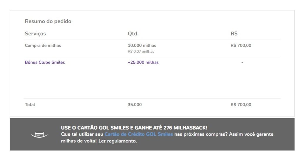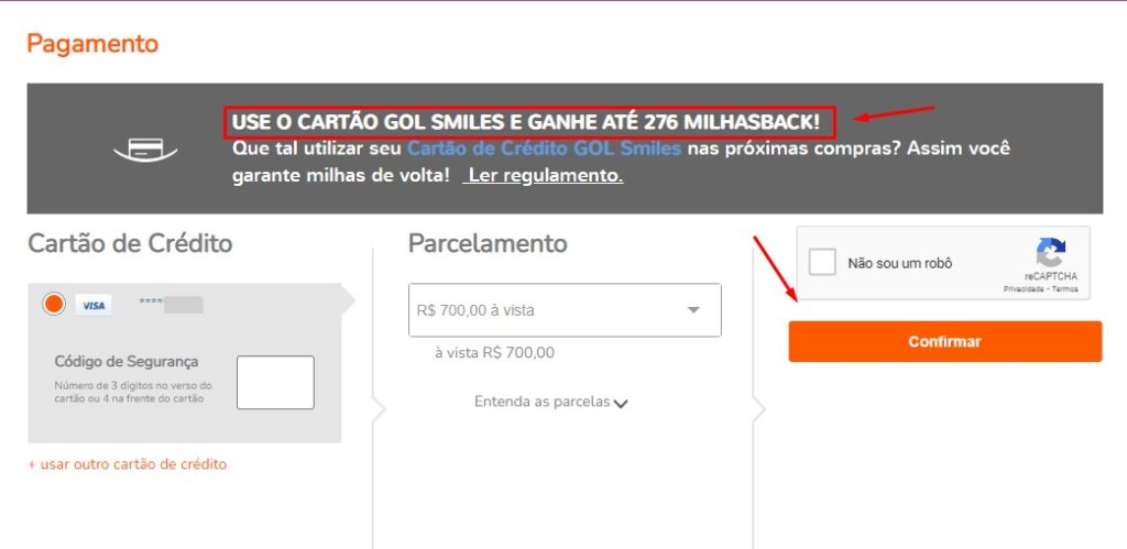 Perceba que na imagem há um banner informando que ao realizar a compra usando um cartão de crédito Gol Smiles, o cliente ainda ganha milhasback.