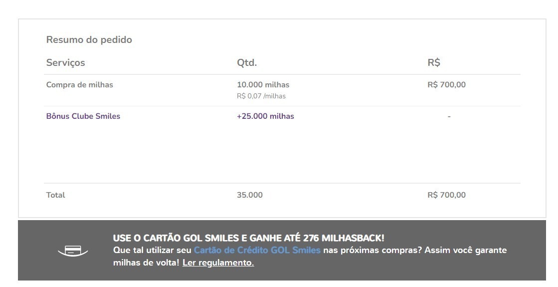 Comprando com cartão de crédito Gol Smiles o cliente ainda recebe milhas de volta conforme o valor investido.