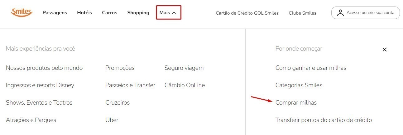 Na home do site Smiles você encontra a opção de comprar milhas Smiles no botão “mais”, localizado no topo da página.