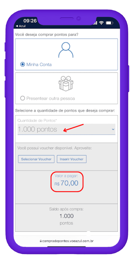 O valor de compra das milhas ou pontos TudoAzul está em R$ 70 o milheiro e não é possível comprar grupos de dezenas ou centenas, apenas milhar.