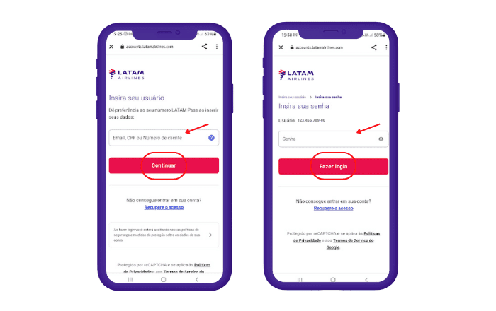 - Abrir o aplicativo LATAM Pass ou site e inserir seu CPF no campo indicado na foto e clique em “Continuar“