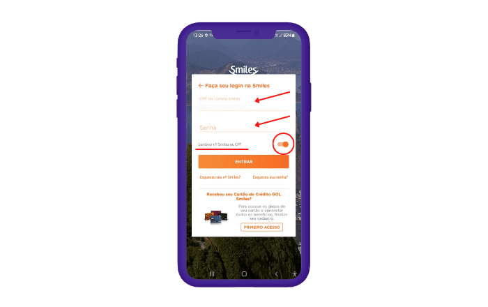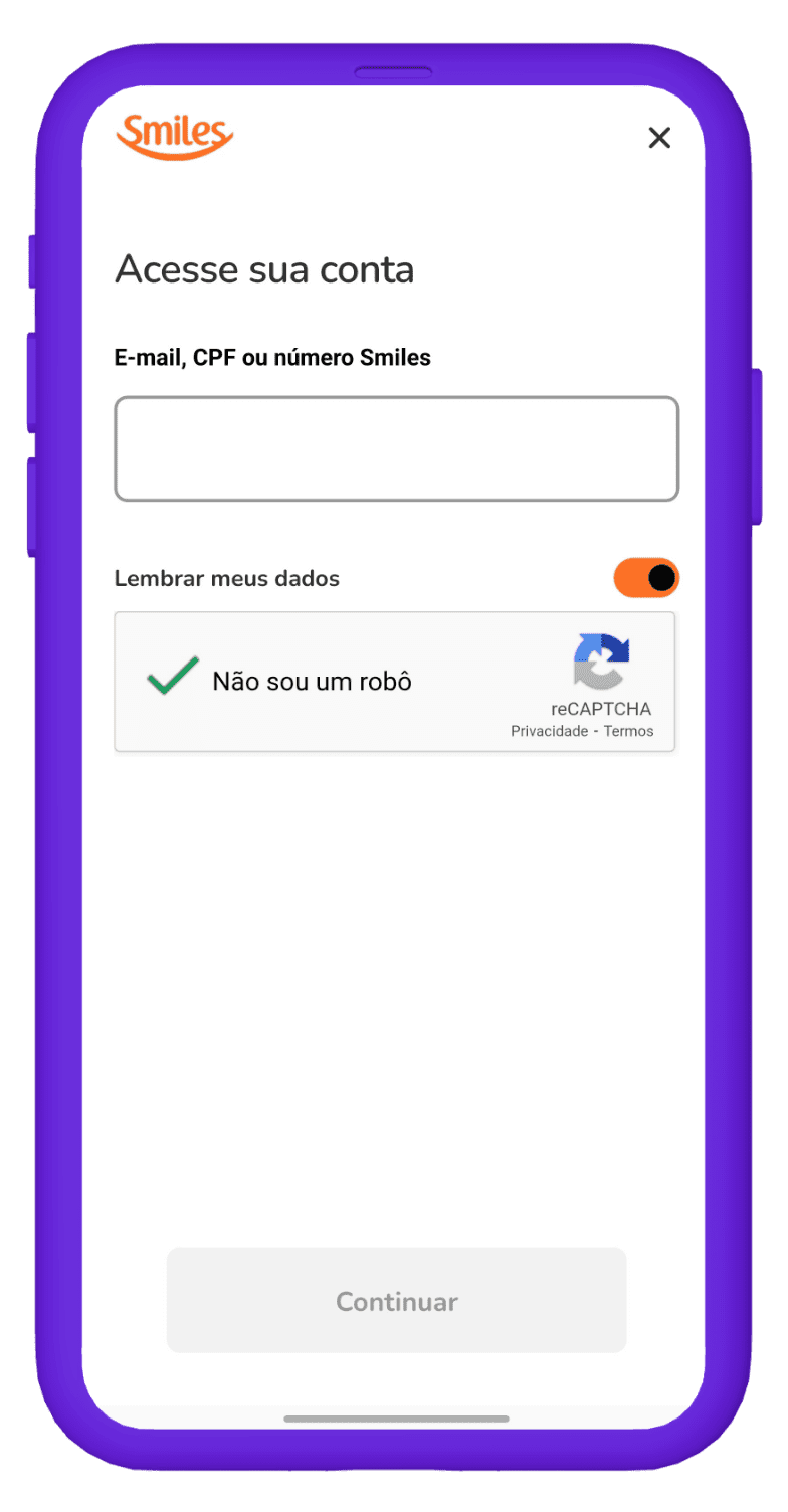 Se preferir, ainda pode deixar marcado para que o aplicativo lembre automaticamente o número do seu CPF ou nº Smiles, assim não precisa mais digitar.