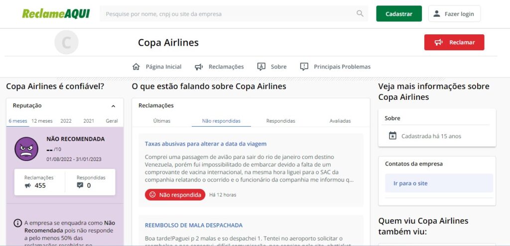 Ao analisarmos a reputação da Copa Airlines no site Reclame Aqui, de acordo com o que é apresentado atualmente, a classificação de “Não Recomendado”, não expressando qualquer nota para ela.