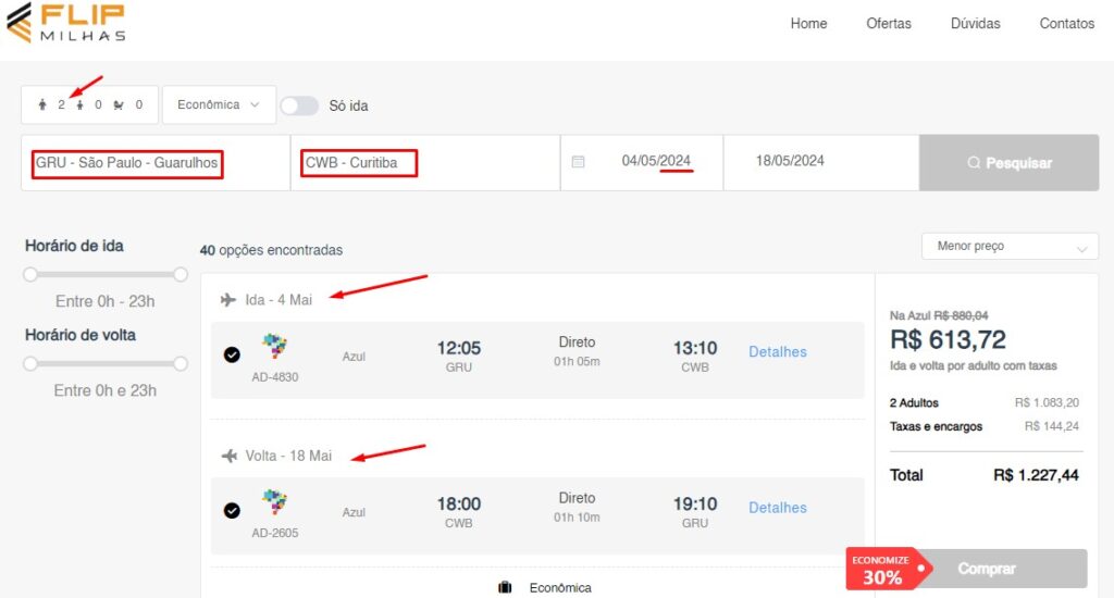 Em seguida, você pode pesquisar as ofertas disponíveis de compra de passagens indicando algumas informações como: