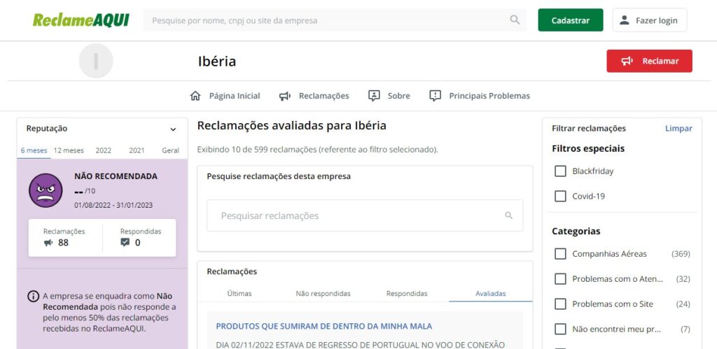 Na plataforma Reclame Aqui, que é um excelente índice de prestação de serviço no Brasil, a Iberia tem uma reputação de “Não Recomendado”, sem nota adicionada.