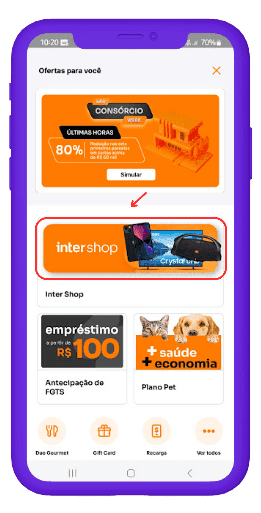 Se prefeir usar o app, assim que abrir procure pelo banner, basta rolar a página para encontrar o espaço dedicado ao Inter Shop.