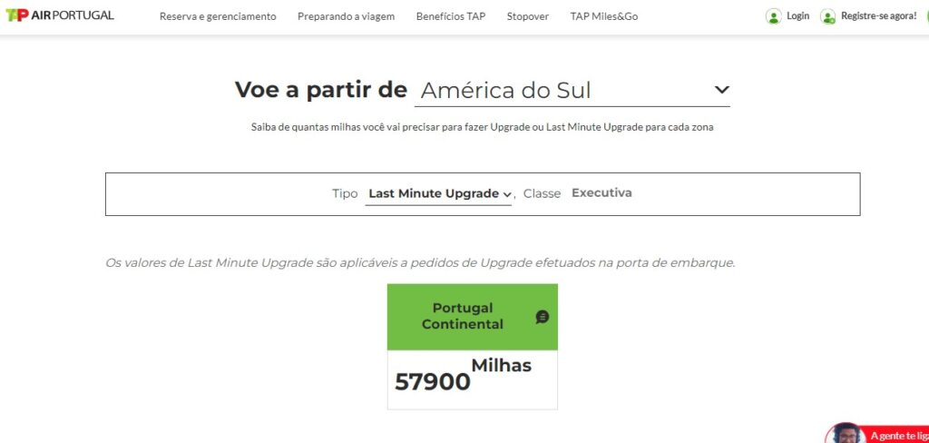 - Upgrade Last Minute: 57.900 milhas da TAP Miles&Go