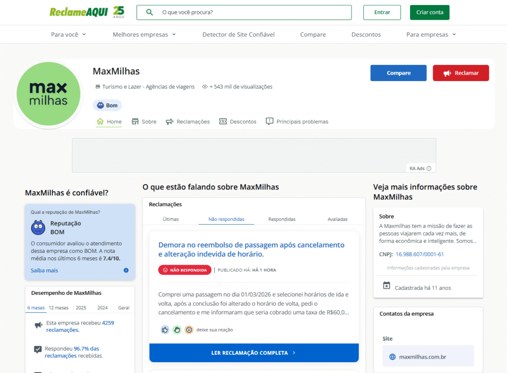 Como está a nota da MaxMilhas no Reclame Aqui atualmente?