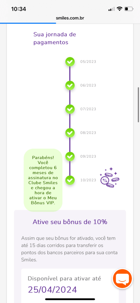 O Meu Bônus VIP é liberado na sua conta GOL Smiles a cada 6 meses de assinatura, tanto para o plano anual como para o plano mensal. Após contabilizar 6 meses o bônus é liberado para ser ativado.