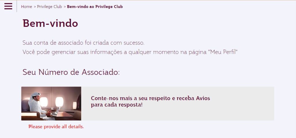 Depois você terá que validar a sua inscrição no Privilege Club através do link no email recebido e só então conseguirá acessar o programa de fidelidade da Qatar.