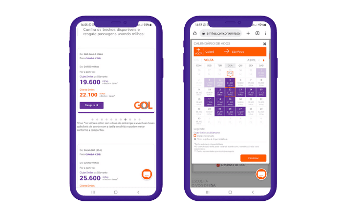 A cada 1 dólar gasto, ganhe até 3 milhas em compras convencionais. Clientes Smiles: Recebe 15.000 milhas na aquisição e acumula a cada 1 dólar gasto = 3 milhas ou 4 milhas em compras no site da GOL.¹ Cliente Clube Smiles e/ou Diamante: Recebe 20.000 milhas na aquisição e acumula a cada 1 dólar gasto = 5,5 milhas ou 6,5 milhas em compras no site da GOL.¹ Suas compras em reais ou em outras moedas estrangeiras são convertidas para dólar americano e geram milhas. O Clube Smiles é um programa de assinatura, mediante pagamento, o qual proporciona milhas bônus, maior validade das milhas e ofertas no Shopping Smiles. As milhas GOL Smiles do cartão Infinite nunca expiram. ¹As milhas de aquisição serão concedidas proporcionalmente a cada pagamento de parcela da anuidade do Cartão. Oferta não válida para upgrade de cartão. |