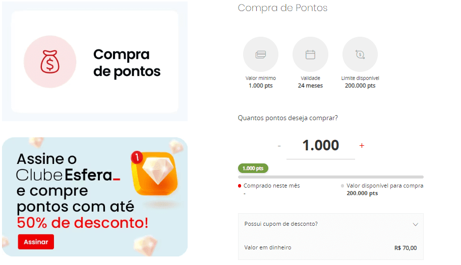 - Ganhe cashback, descontos e mais pontos com a Esfera: compre no shopping Esfera e receba parte do valor de volta. Aproveite também, descontos em parceiros, opções para juntar mais pontos e trocar por produtos, viagens, experiência, vales-compra e muito mais.