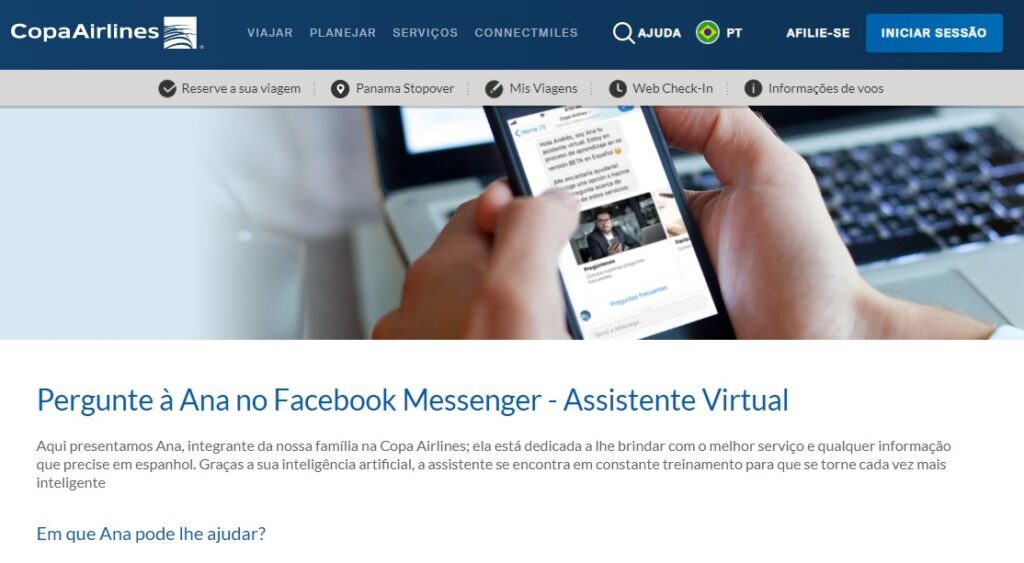 Basta acessar a página “Fale Conosco” e clicar na opção “Ask Ana no Facebook Messenger” para iniciar a conversa com a assistente virtual.
