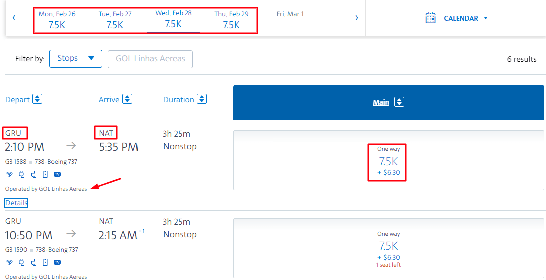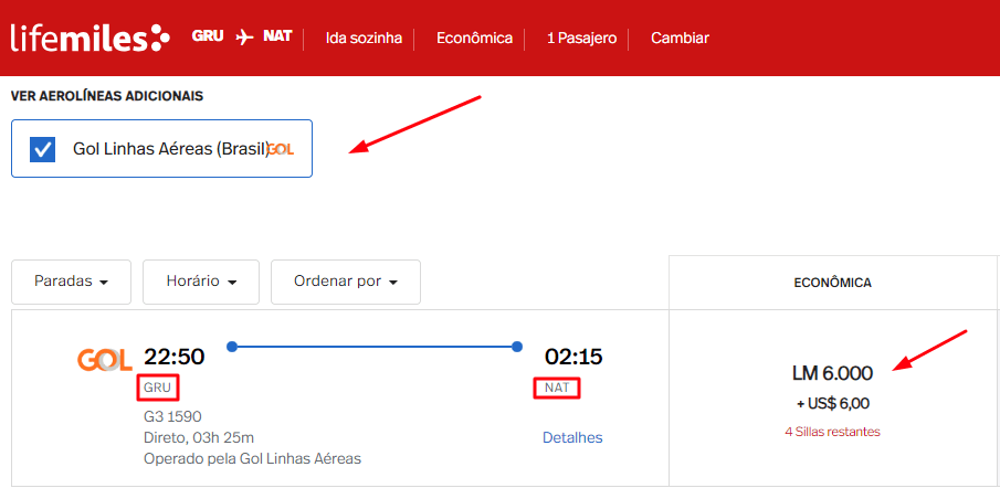 Em nossa simulação fizemos uma busca saindo de Guarulhos SP em direção a Natal, Rio Grande do Norte e as milhas cobradas para o trecho são de 6 mil + 6,00 dólares de taxas.