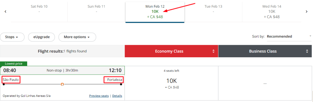 Como exemplo, fizemos uma pesquisa saindo de Guarulhos com destino a Fortaleza – CE, em fevereiro e encontramos diversas datas, com voos diretos e com valor 10 mil milhas o trecho + 48 dólares de taxa.