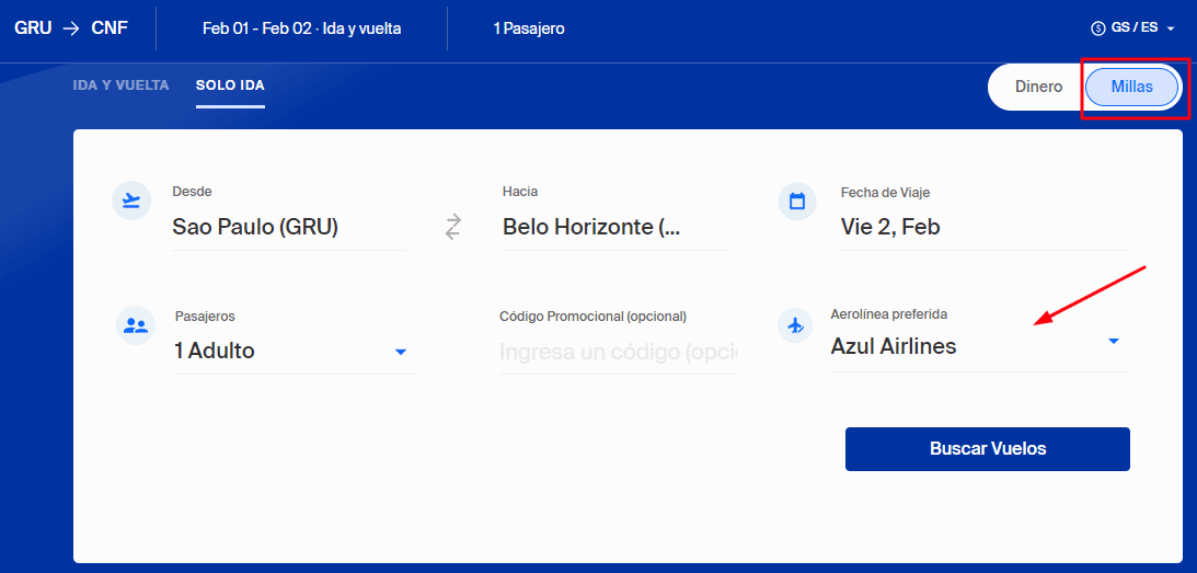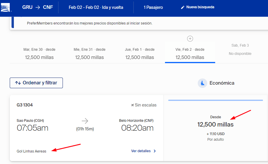 Acione a opção ‘Reservar con millas’ para que apenas os voos de ambas as aéreas nacionais apareceram no resultado da busca.