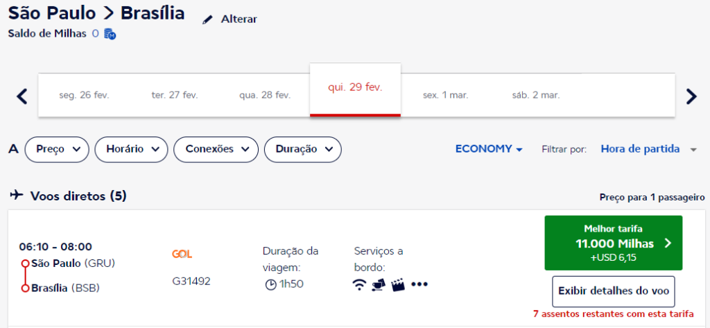 Fizemos uma pesquisa saindo de São Paulo, Guarulho com destino a Brasília e o trecho em um voo direto está custando 11 mil milhas mais 6,15 dólares de taxa de embarque.