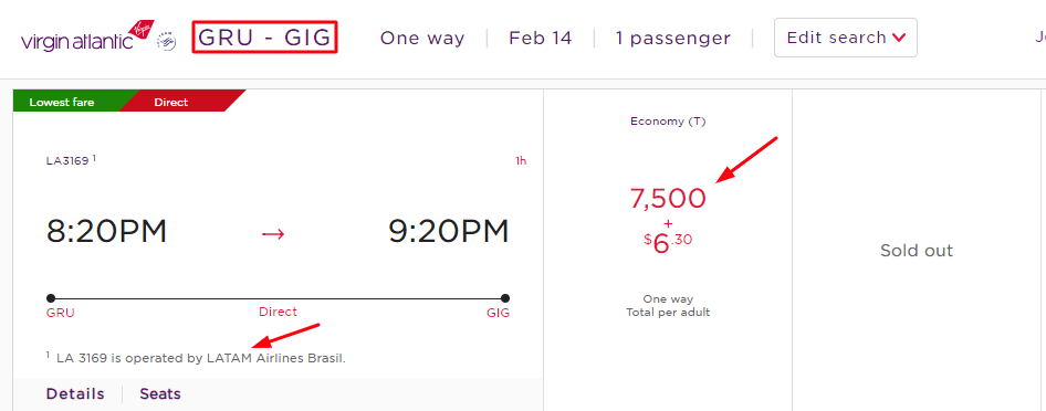 Para voar com milhas da Flying Club, da Virgin Atlantic no Brasil é só identificar os trechos que a LATAM oferece voo e depois pesquisar no site da Virgin.