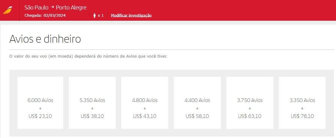 Isso permite tanto comprar com o máximo de pontos Avios quanto com o mínimo e complementação da passagem em dinheiro.
