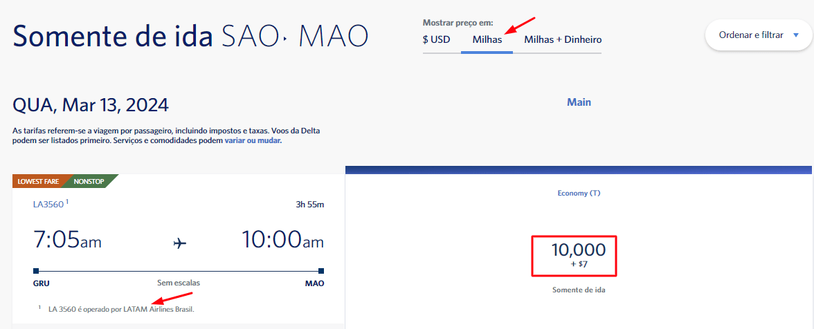Confirmamos o valor da tabela fixa de 7500 milhas e a cobrança de 6,30 dólares por trecho, conforme imagem a seguir.