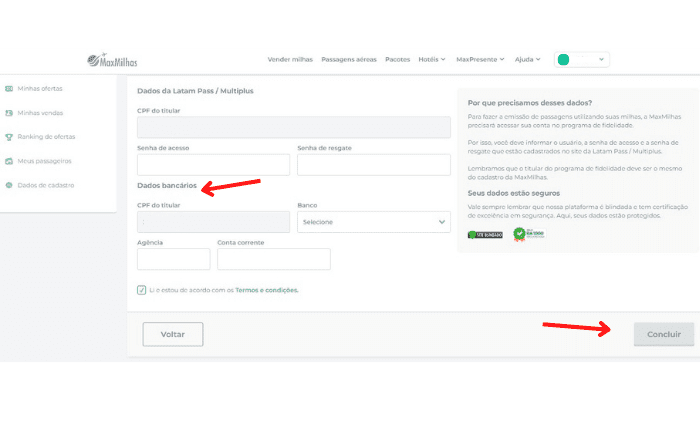 - Agora diga em qual banco deseja receber o pagamento pelas milhas vendidas, inserindo Banco, Agência e conta corrente.