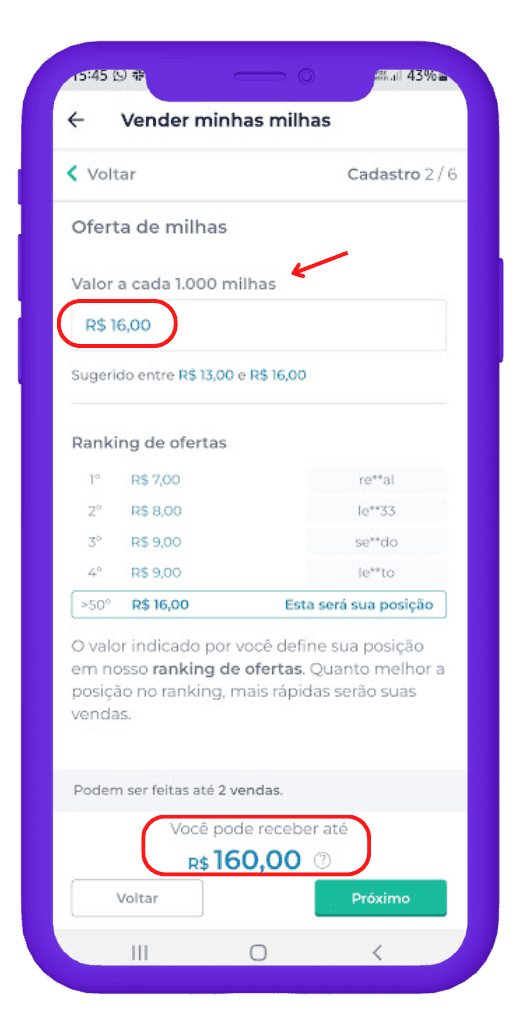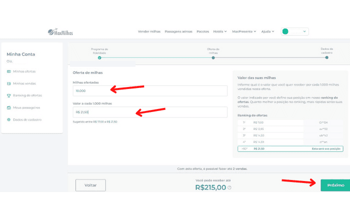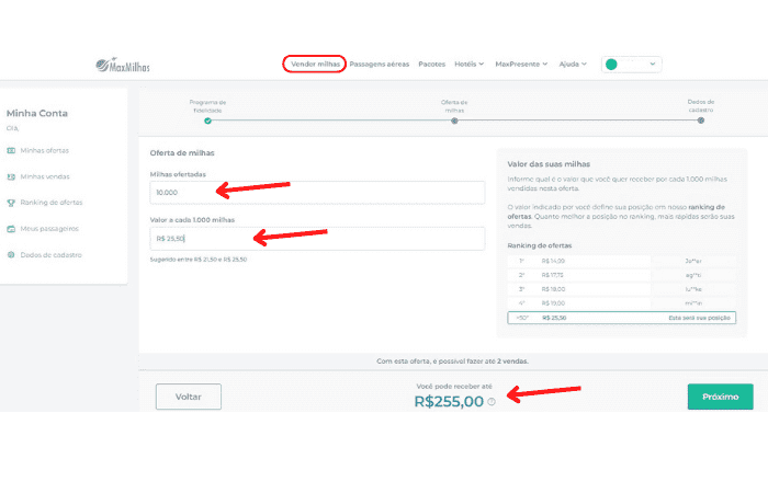 - Aponte o valor que deseja receber pelo milheiro, lembrando que não é qualquer valor, a MaxMilhas sugere um valor mínimo e máximo de venda. Além disso, o posicionamento que você irá ocupar da preferência de ofertas.