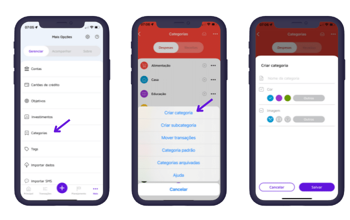 - Personalizar categorias, subcategorias e tags que vão te ajudar a caracterizar suas movimentações financeiras;