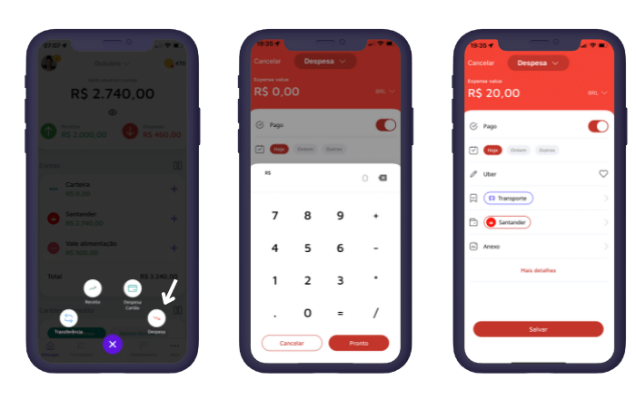 Para adicionar uma despesa você vai repetir o mesmo processo. A principal diferença é que, sempre que efetivar uma despesa, terá o valor descontado na conta escolhida. Pois, assim, você saberá exatamente quanto tem ainda disponível em suas contas considerando os seus gastos.