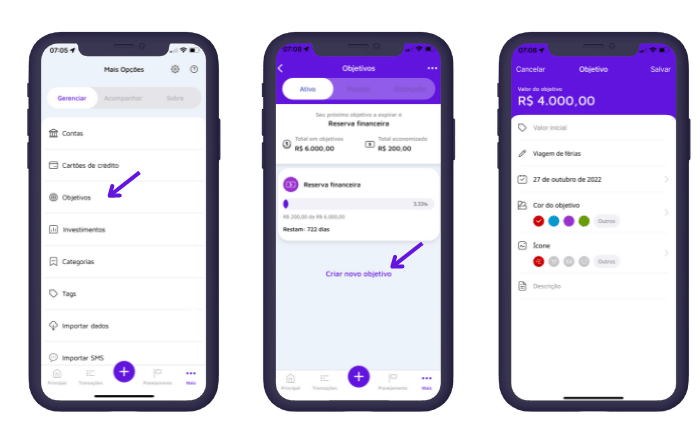 Com objetivos criados, você vai definir planos financeiros que vão te ajudar a guardar dinheiro para os seus objetivos.