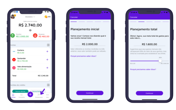 Na seção de planejamento financeiro do app, clique em adicionar um novo, informe o valor máximo que pretende gastar, ajuste o percentual de gastos sabendo que o ideal é poupar cerca de 20% da sua renda todos os meses, escolha as categorias e subcategorias que deseja definir teto de gastos, depois informe qual o valor máximo que pretende gastar com elas.