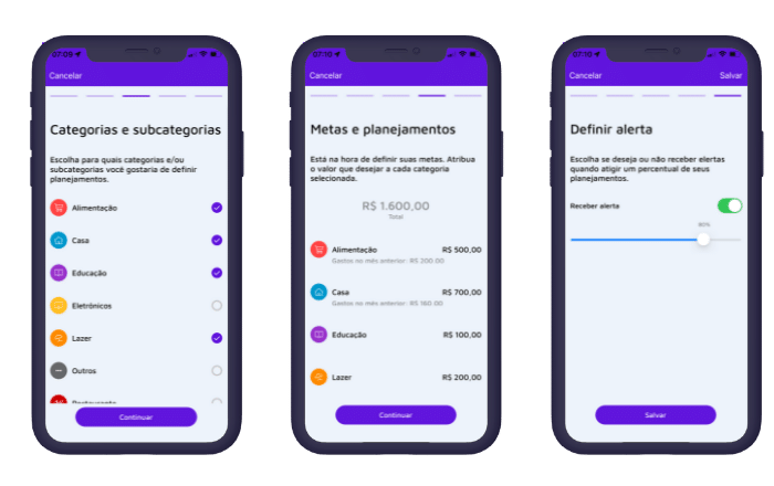 - Definir planos financeiros e alertas de despesas para fechar o mês com o saldo positivo;