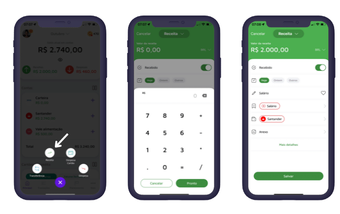 Na tela inicial do app, clique em +, depois clique em ‘Receita’, informe o valor recebido, e informe a data de recebimento.