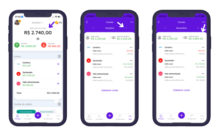 Ah, vale destacar que você consegue ver tanto o seu saldo previsto quanto as despesas previstas para cada mês, considerando também as faturas dos seus cartões. Demais, né?