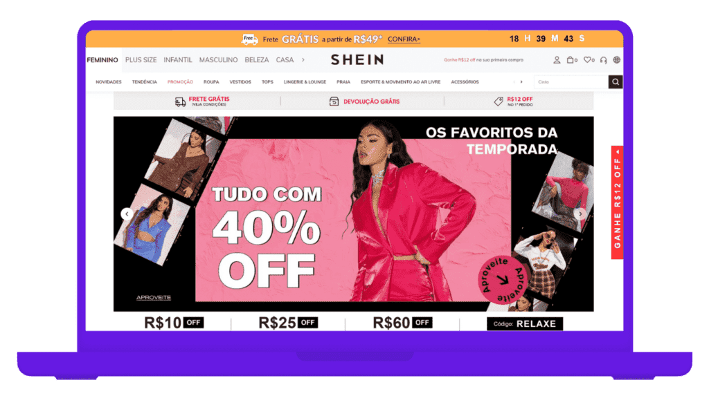 O site da Shein é um marketplace que que dedica grande parte de seu segmento para a moda feminina.
