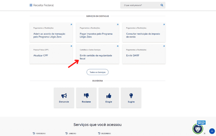 Na página da RFB, selecione a opção “Emitir certidão de regularidade fiscal (CND)”. Ela está entre os serviços em destaque;